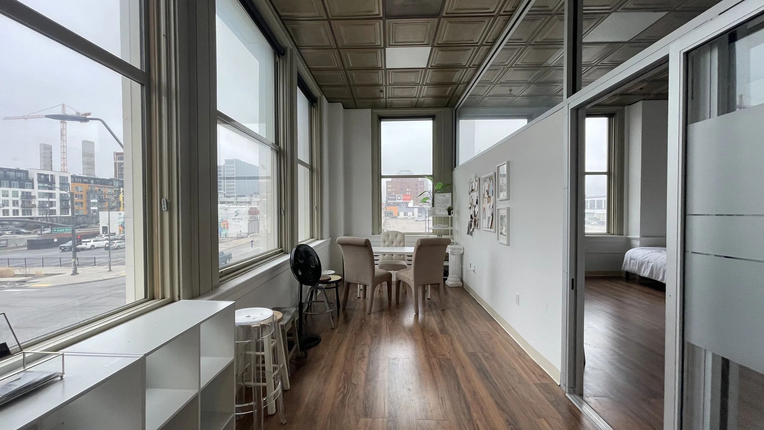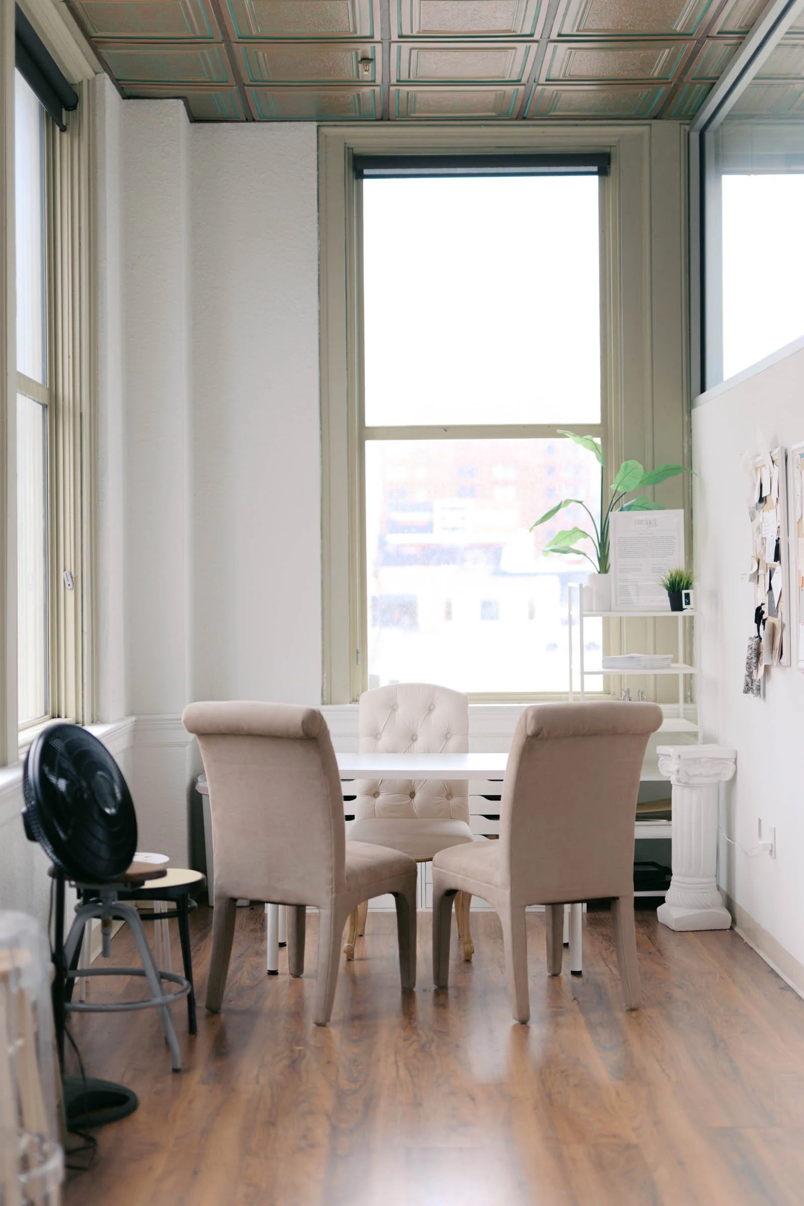 The space features north and west-facing windows that provide soft, flattering natural light throughout the day, creating an airy and timeless look in-camera.